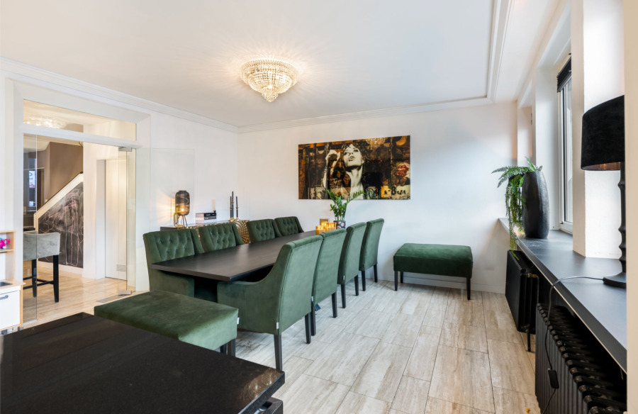 Ein heller und großzügiger Wohnbereich mit Kaminecke prägt das erste Obergeschoss. Die großen Ganzglastüren im Wohn- und Esszimmer schaffen eine helle und einladende Atmosphäre und bieten Zugang zur weitläufigen Dachterrasse. Gegenüberliegend befinden sich das Esszimmer und die angrenzende Küche mit einem praktischen Hauswirtschaftsraum, von denen aus ein weiter Blick auf den Marktplatz gegeben ist. Ein Gäste-WC ergänzt die Ausstattung dieser Etage. Die Räume sind mit eleganten Fliesen- und Travertinböden ausgestattet, die stilvolle Akzente setzen.