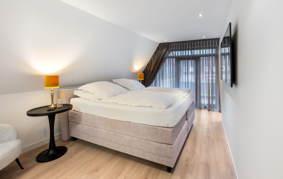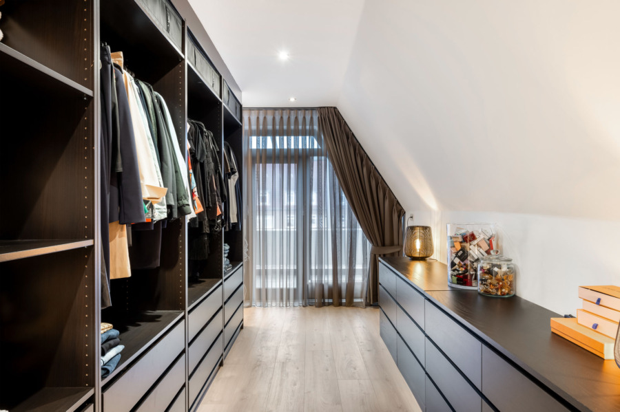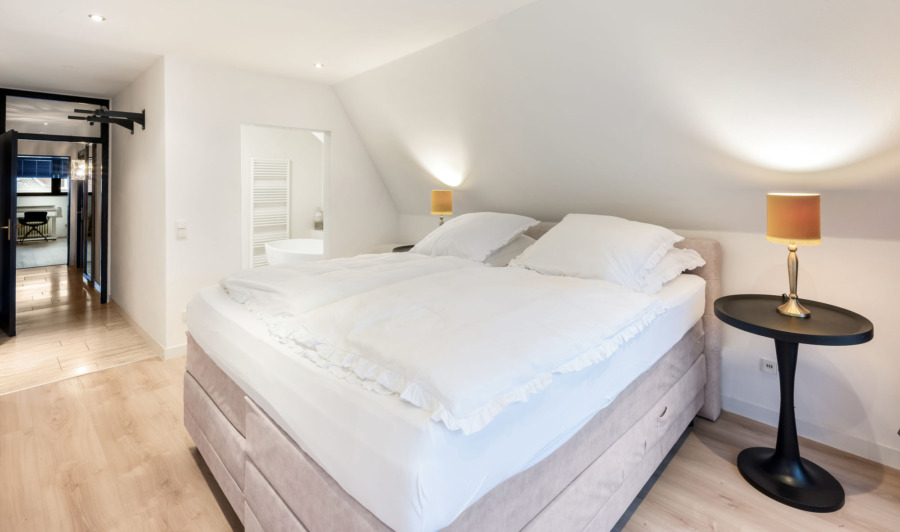 Das Hauptschlafzimmer verfügt über einen großzügigen Ankleidebereich und Zugang zu einem Balkon in Ostausrichtung, der zusätzlich Zugang zur Dachterrasse bietet. Ein großes Badezimmer mit Dusche, Badewanne und WC ist sowohl vom Schlafzimmer als auch vom Flur zugänglich und beinhaltet einen Abstellraum, der als Sauna umgestaltet werden kann. Ergänzt wird die Etage durch ein separates Appartement mit eigenem Wohnbereich, Schlafecke und WC, das über vorbereitete Anschlüsse für eine Dusche verfügt. Die Räume sind mit Teppichboden ausgelegt, während der Flur in Travertin gehalten ist.