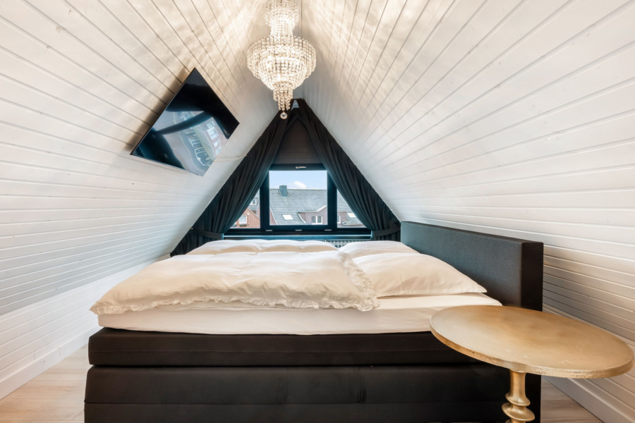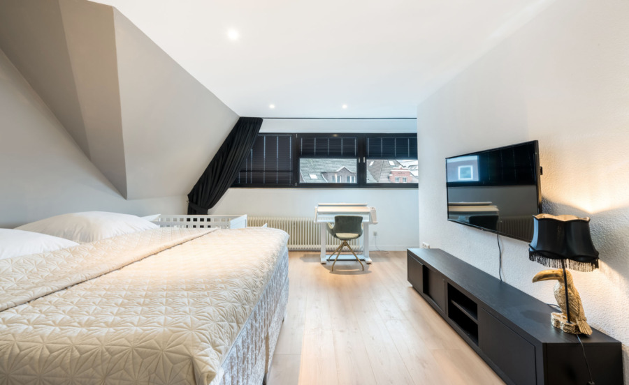 Das ausgebaute Dachgeschoss umfasst zwei Schlafräume mit großen Dreiecksfenstern, die einen beeindruckenden Blick auf den Marktplatz und die umliegenden Dächer gewähren. Ein weiteres Badezimmer mit Dusche und WC sowie ein Abstellraum, der optional um ein separates WC ergänzt werden kann, komplettieren diese Etage. Der durchgehende Teppichboden im Dachgeschoss sorgt für eine behagliche Wohnatmosphäre.