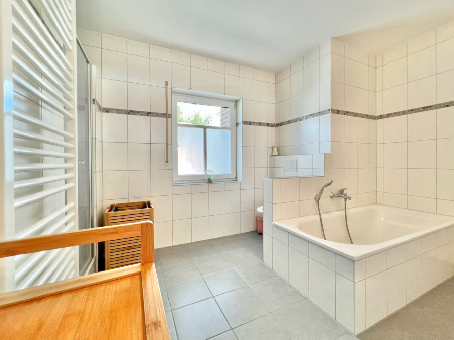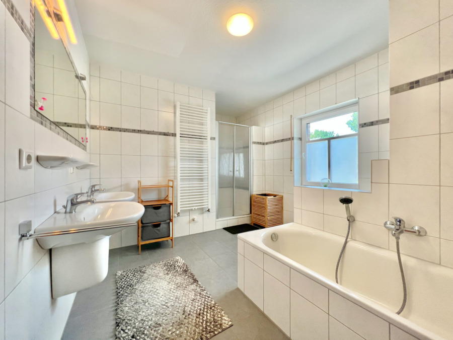 • Tageslichtbad mit Dusche, Badewanne, WC, 2 Waschbecken, Fußbodenerwärmung und Handtuchheizkörper