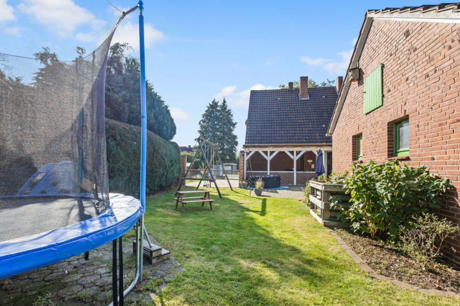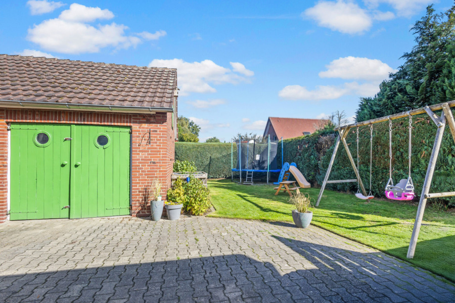 Der Außenbereich ist gepflegt angelegt und umfasst einen Geräteraum, ein Holzlager, Rasenflächen und Beete. Hecken und Zäune sorgen für Teil-Einfriedungen. Für Fahrzeuge stehen ausreichend gepflasterte Stellplätze zur Verfügung.