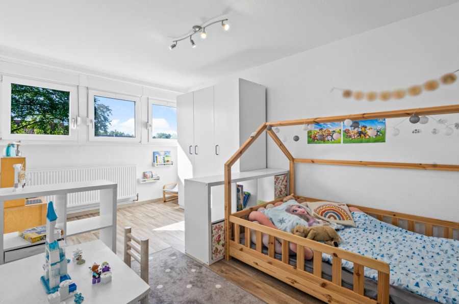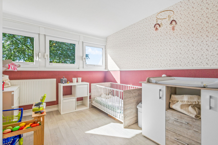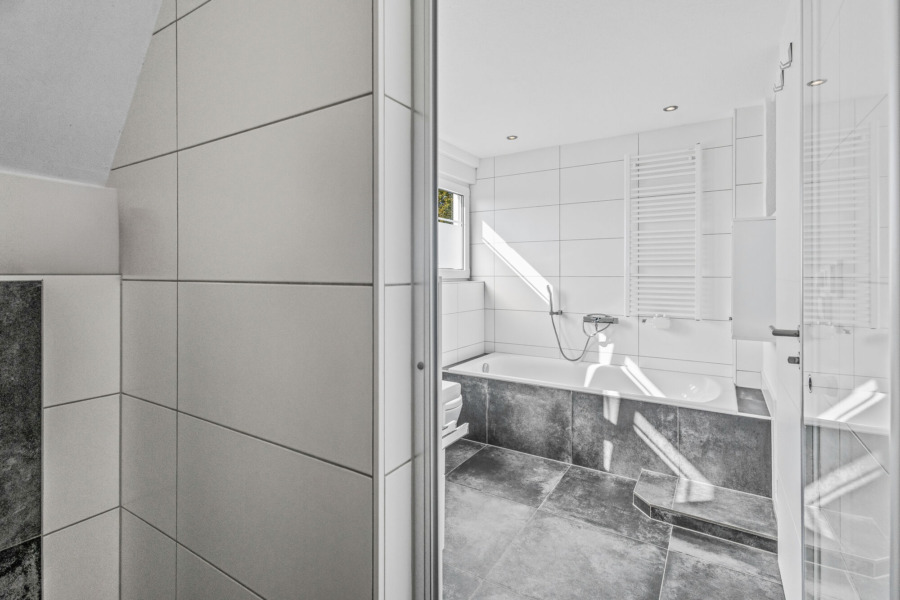 Im Obergeschoss stehen bis zu vier Schlafzimmer zur Verfügung. Ein separater Ankleideraum mit Einbauschrank schafft zusätzlichen Stauraum. Das großzügige Badezimmer ist mit ebenerdiger Dusche, Badewanne, WC, Waschbecken und elektrischer Fußbodenheizung ausgestattet.