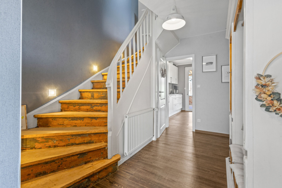 Das Erdgeschoss überzeugt mit einem hellen Wohn- und Essbereich, ausgestattet mit einem Holzofen aus dem Jahr 2011. Die Küche verfügt über eine moderne Einbauküche, die im Kaufpreis enthalten ist, und ermöglicht den direkten Zugang zur überdachten Terrasse und in den Garten. Ein Gäste-WC mit Fenster sowie Windfang und Flur mit Platz für eine Garderobe runden das Raumangebot ab.