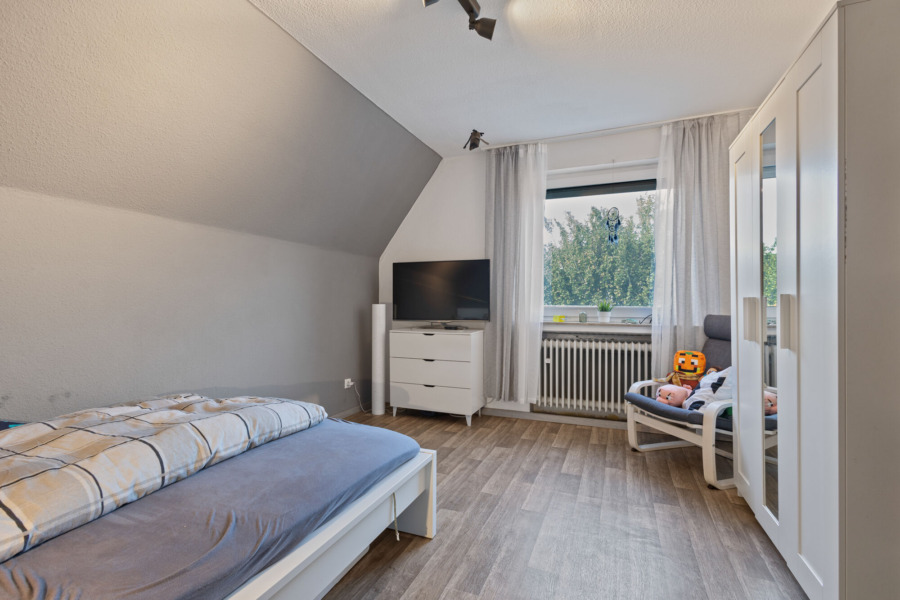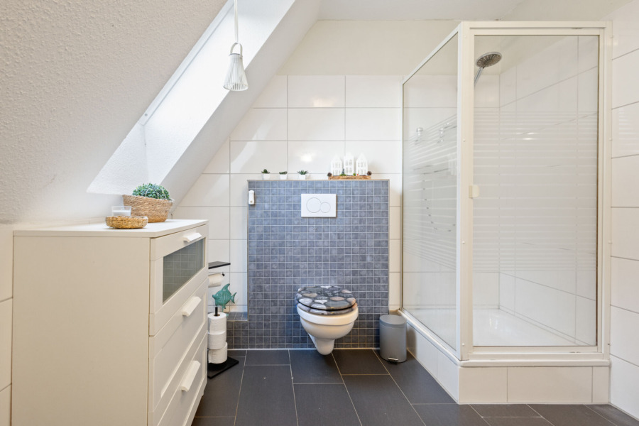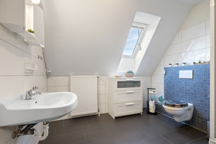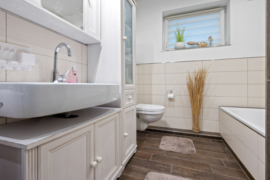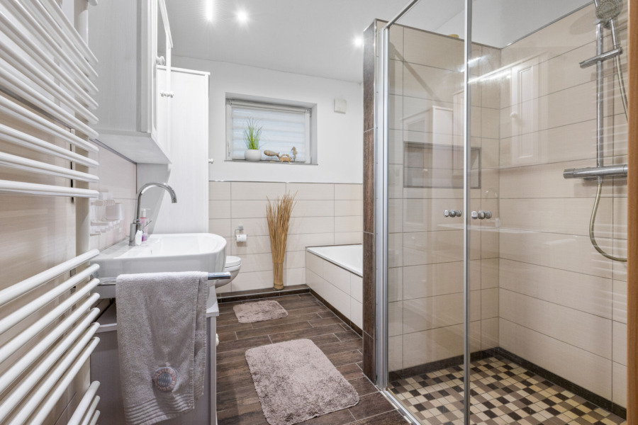 Ein angrenzender, durch Trockenbau getrennter Raum lässt sich als Büro-, Gäste- oder Hobbyzimmer nutzen und kann bei Bedarf wieder in den Wohnbereich integriert werden. Das modernisierte Tageslichtbad aus 2017 ist mit ebenerdiger Dusche und Badewanne ausgestattet. Ergänzend stehen ein Schlafzimmer, ein Windfang sowie ein Gäste-WC mit Anschlüssen für Waschmaschine und Trockner zur Verfügung. Der Teilkeller ist über den Flur im Erdgeschoss zugänglich.