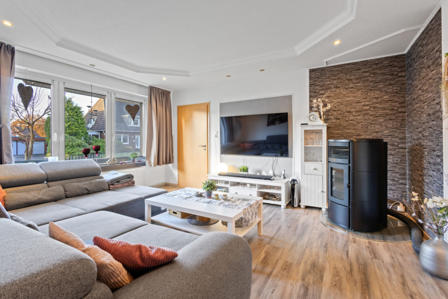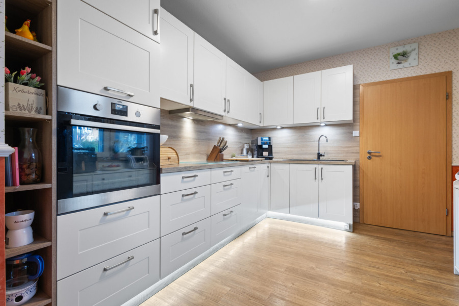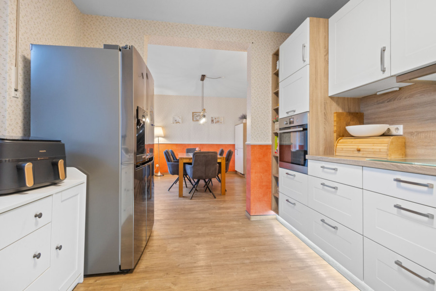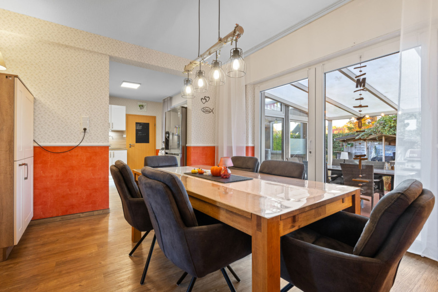 Im Erdgeschoss befindet sich der zentrale Wohnbereich mit Küche, Esszimmer und Wohnzimmer. Die Küche von 2017 ist mit einer Einbauküche ausgestattet und bietet Zugang zur überdachten Terrasse. Das Wohnzimmer verfügt über einen Pelletofen aus 2020 mit Zuluftführung in Flur und Küche; sowohl Ofen als auch Einbauküche sind im Kaufpreis enthalten.