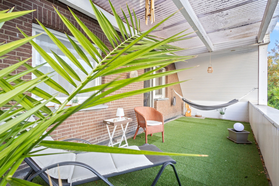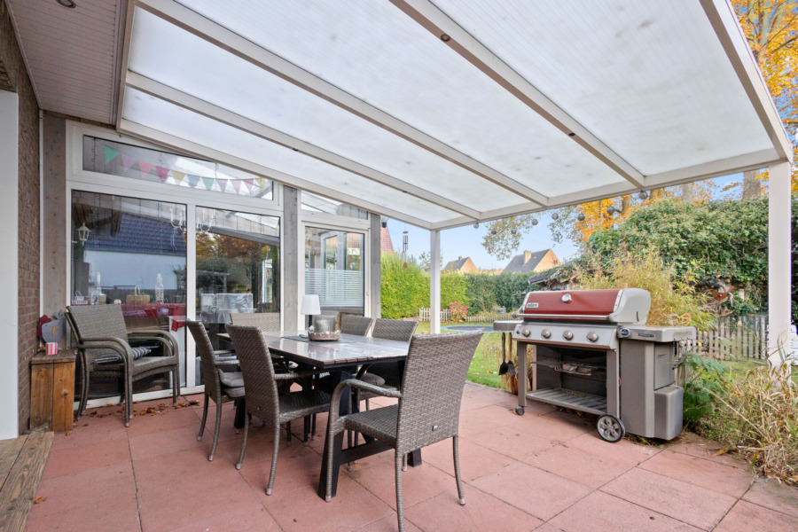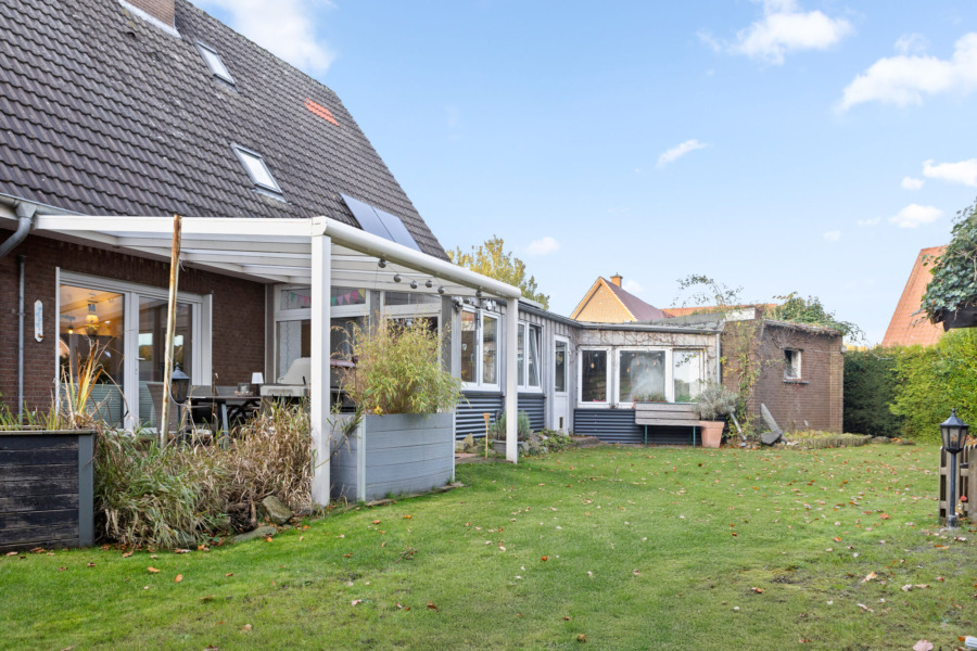 Der Garten ist vor und hinter dem Haus angelegt und vollständig mit Hecken und Zäunen eingefriedet. Eine überdachte Terrasse und ein Wintergarten bieten geschützte Aufenthaltsbereiche im Freien. Weitere Ausstattungsmerkmale sind ein Holzgartenhaus, eine Bewässerungsanlage, sowie ein eingelassenes Trampolin – diese Elemente sind im Kaufpreis enthalten.