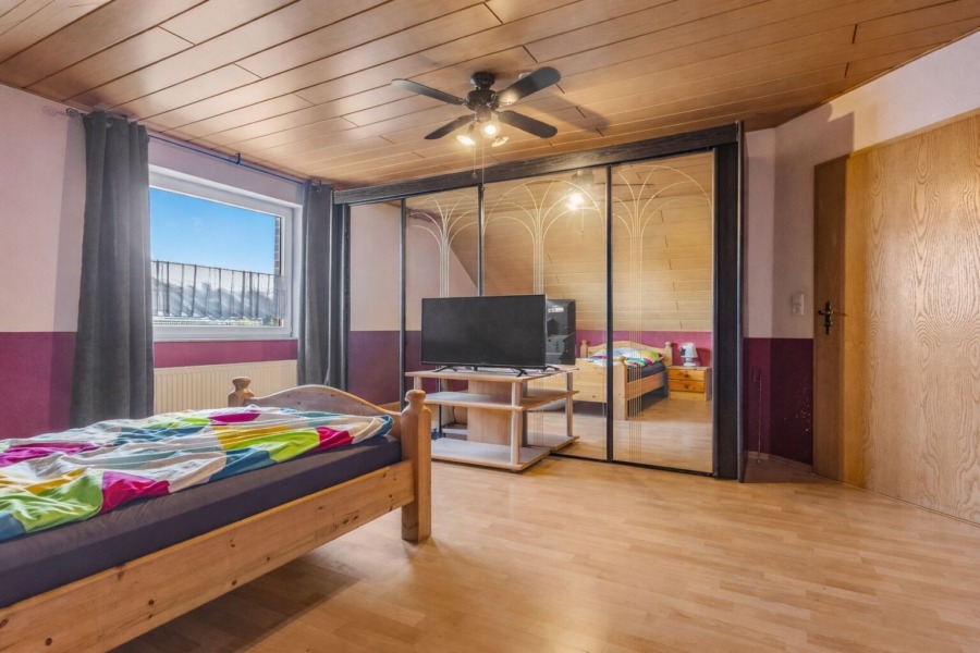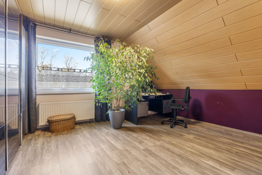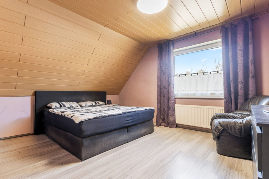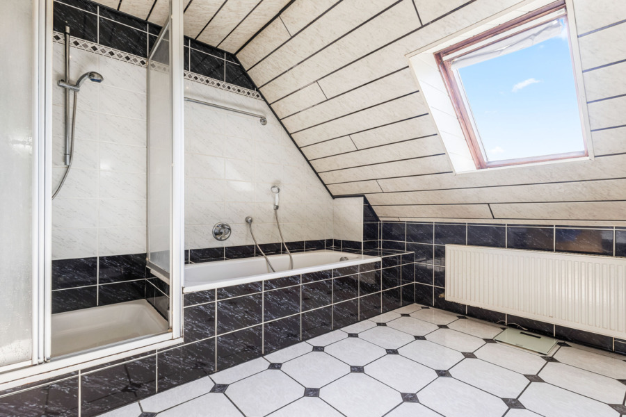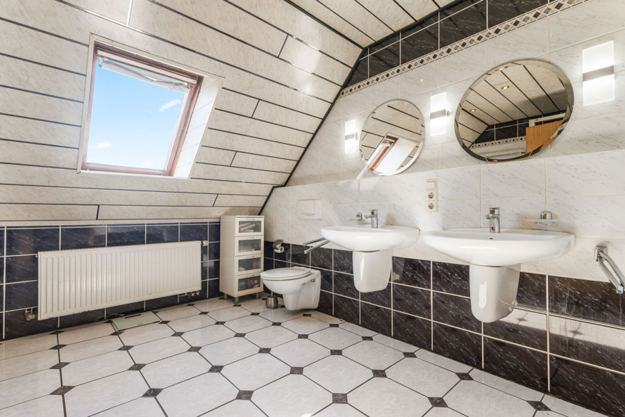 Im Dachgeschoss stehen vier Schlafzimmer zur Verfügung. Das Tageslichtbad ist mit zwei Waschbecken, Dusche, Badewanne und WC sowie einer Fußbodenheizung ausgestattet.