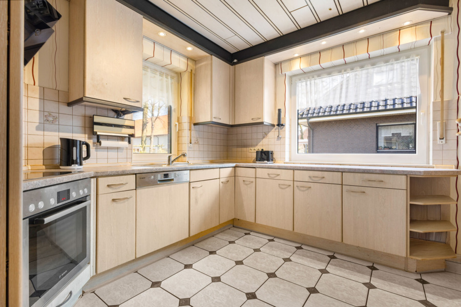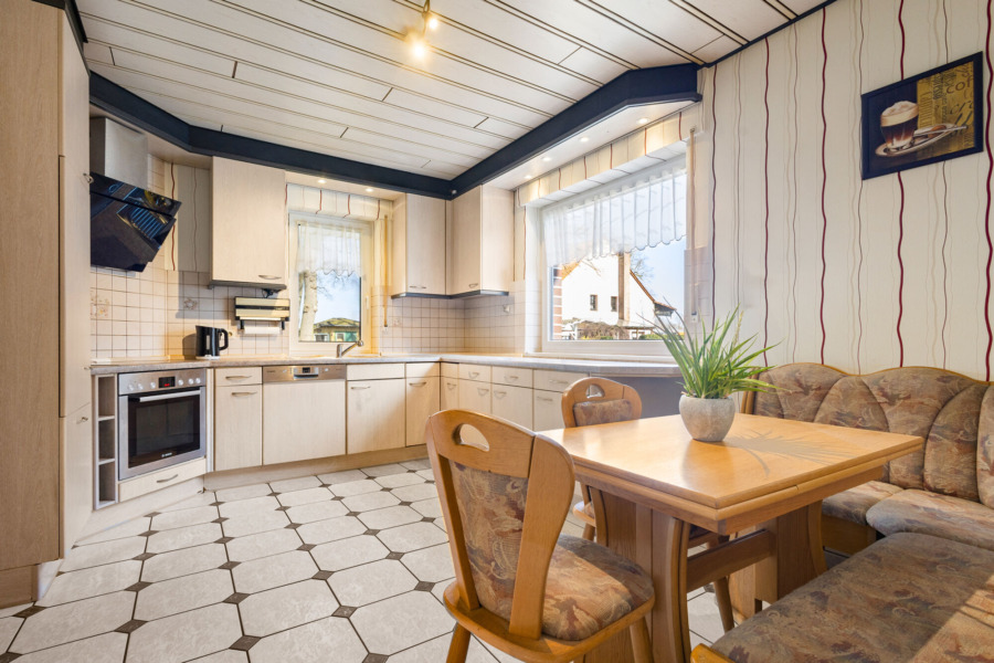 Die Küche ist mit einer Einbauküche (im Kaufpreis enthalten) ausgestattet und bietet ausreichend Platz für eine Essecke. Die vorhandene Fußbodenheizung ergänzt den Wohnkomfort in diesem Bereich. Angrenzend befindet sich ein Vorratsraum, der zugleich die Verbindung zum Wintergarten und zur Garage schafft.
