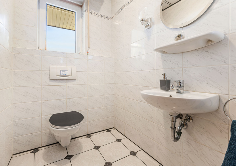 Ergänzt wird das Erdgeschoss durch eine Diele mit Platz für eine Garderobe, ein Gäste-WC sowie einen Hauswirtschaftsraum mit Anschlüssen für Waschmaschine und Trockner.