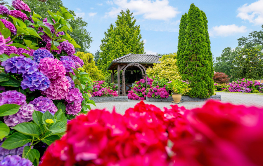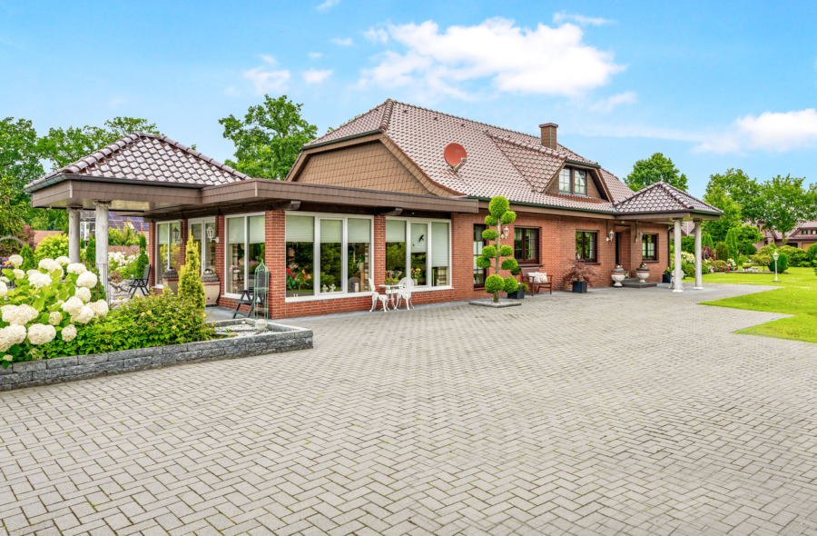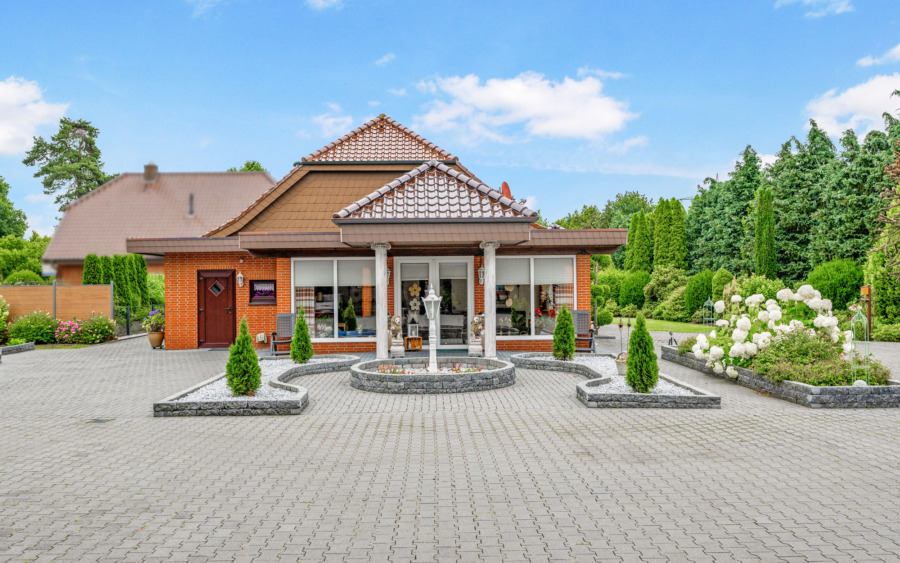 An das Wohnhaus angrenzend befinden sich großzügig gepflasterte Hofflächen, die vielfältige Nutzungsmöglichkeiten bieten – etwa als Stellflächen oder für gesellige Anlässe. Hochbeete, blühende Sträucher, kleine Lauben sowie dekorative Garten- und Sitzelemente sorgen für eine abwechslungsreiche und zugleich durchdachte Gesamtwirkung.