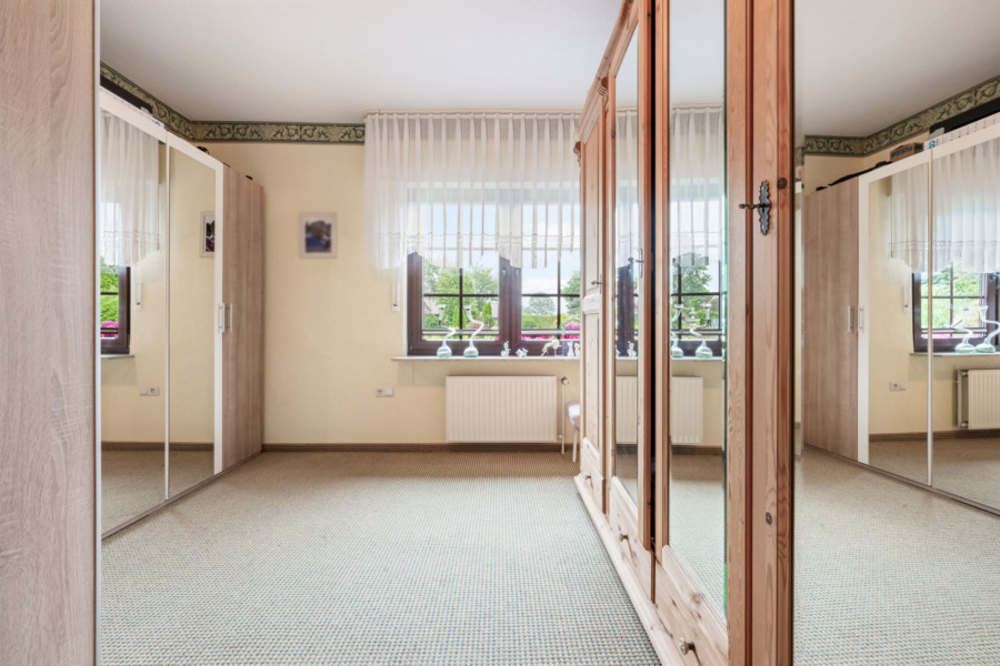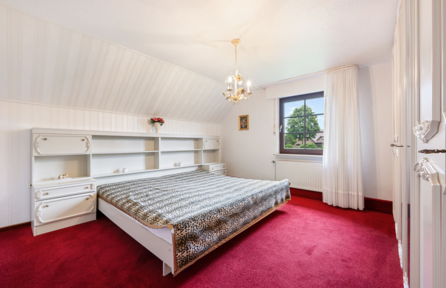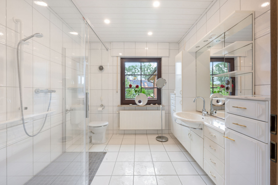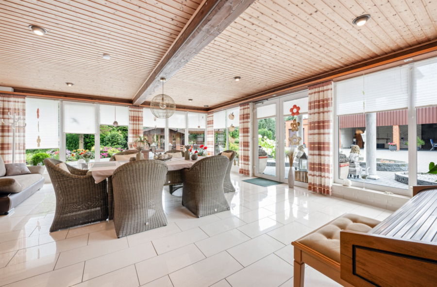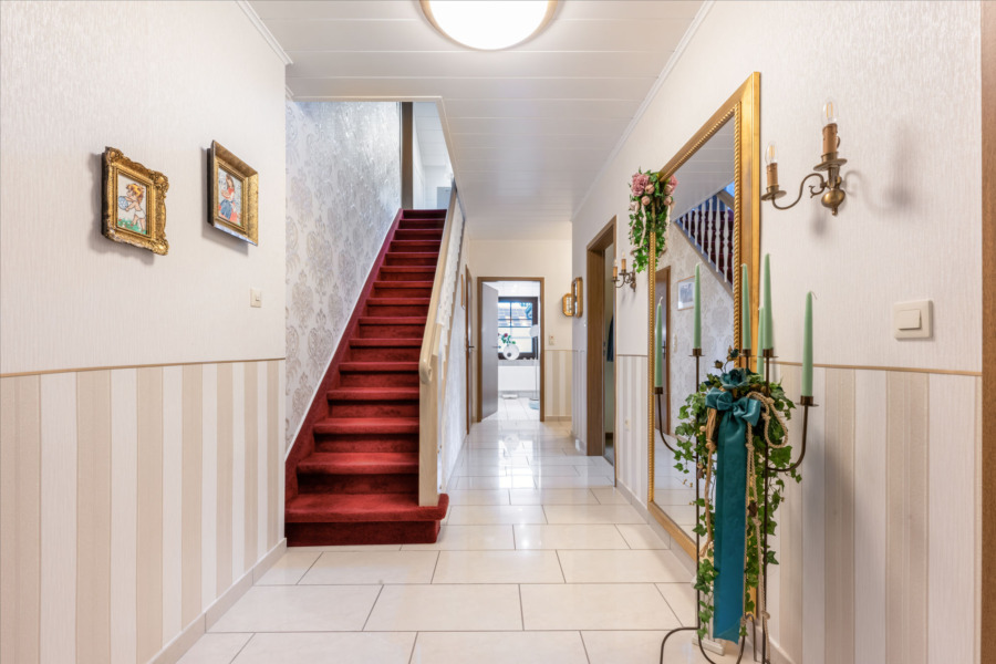 Von der Diele erschließt sich ein erster Flurbereich, der zu drei Schlafzimmern sowie einem modernisierten Tageslichtbad mit ebenerdiger Dusche führt. Ein zweiter, angrenzender Flur verbindet die Küche, das separate Gäste-WC, den Hauswirtschaftsraum, den separaten Wäscheraum mit Anschlüssen für Waschmaschine und Trockner sowie den beheizten Wintergarten mit angrenzendem Abstellraum.