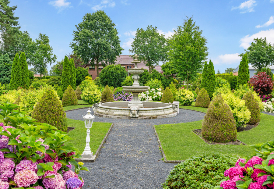 Im östlichen Bereich des Grundstücks erstreckt sich ein formaler Ziergarten mit klarer Wegeführung, eingefassten Beeten und einem zentral platzierten Springbrunnen. Dieser Teil des Gartens vermittelt einen beinahe herrschaftlichen Eindruck und ist das gestalterische Herzstück der Anlage.