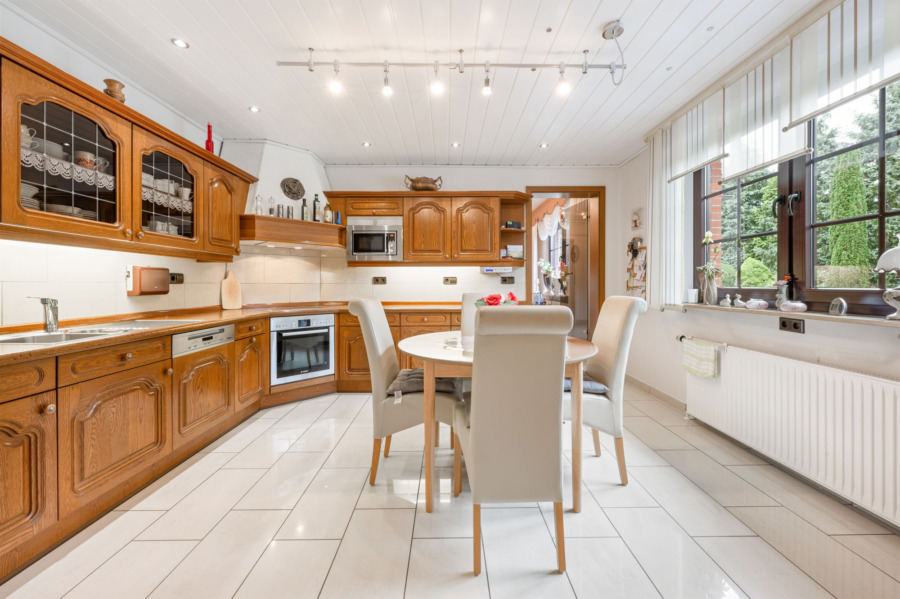 Im Erdgeschoss bildet der großzügige Wohn- und Essbereich mit angrenzender Küche samt Einbauküche den zentralen Mittelpunkt des Hauses. Die Einbauküche ist im Kaufpreis enthalten. Im Wohn- und Esszimmer sorgt eine Fußbodenerwärmung für zusätzlichen Komfort.
