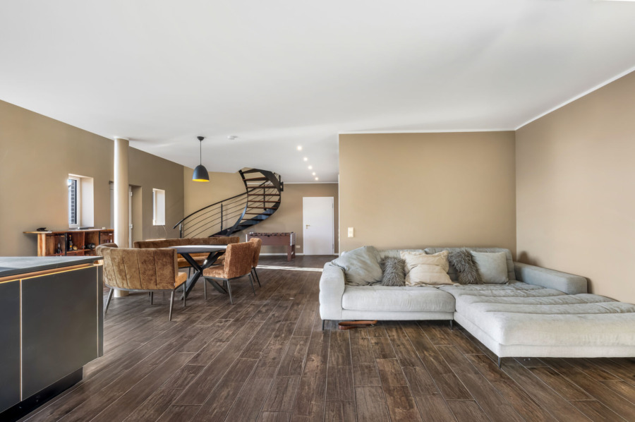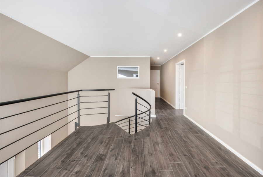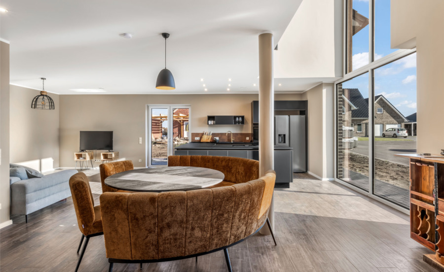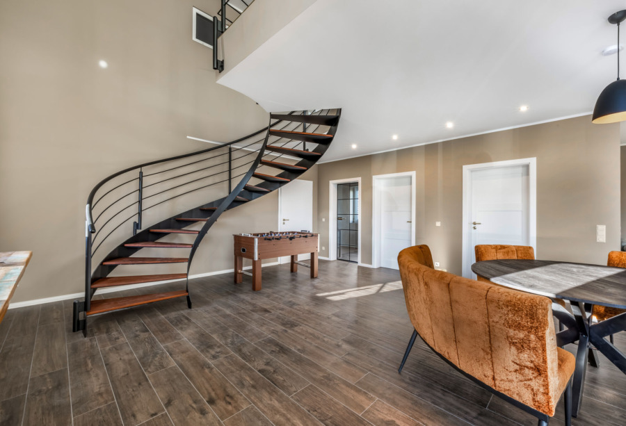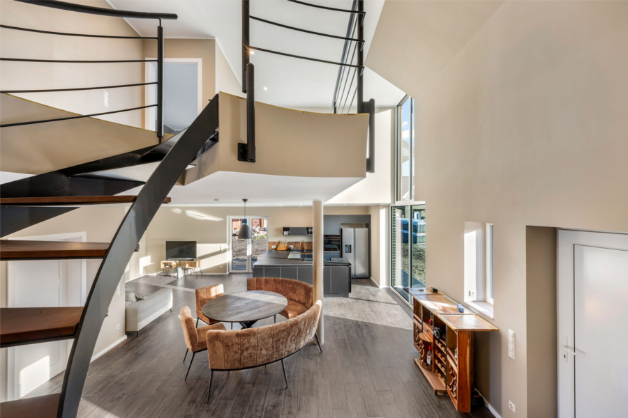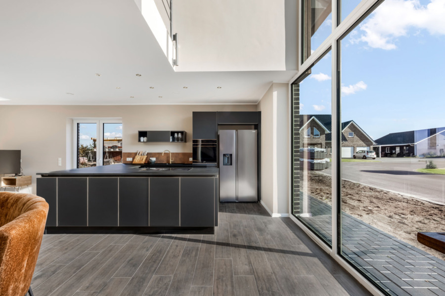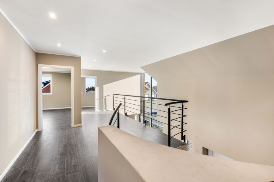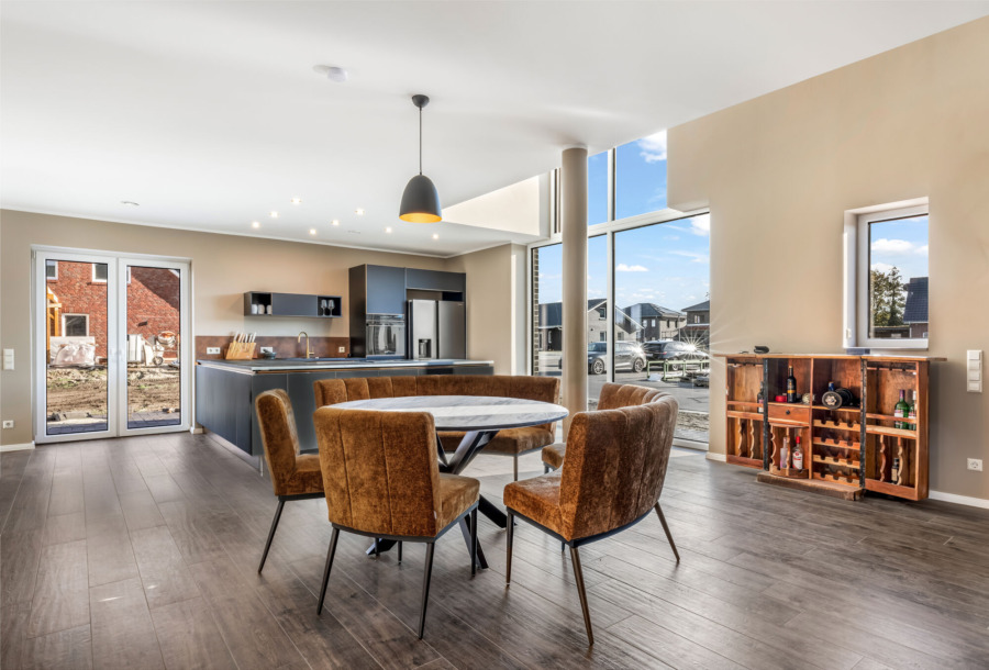 Im Erdgeschoss zeigt sich das offene Wohnkonzept besonders eindrucksvoll. Der großzügige Wohn- und Essbereich mit integrierter, hochwertiger Einbauküche (im Kaufpreis enthalten) bildet den Mittelpunkt des Hauses. Die offene Galerie betont das luftige Raumgefühl und sorgt für eine besondere Wohnatmosphäre. Eine vollflächige Fußbodenheizung, betrieben durch eine energieeffiziente Wärmepumpe, sorgt im gesamten Haus für gleichmäßige Wärme. Fliesen in Holzoptik sowie weiße Innentüren mit goldfarbenen Drückergarnituren setzen klare gestalterische Akzente.