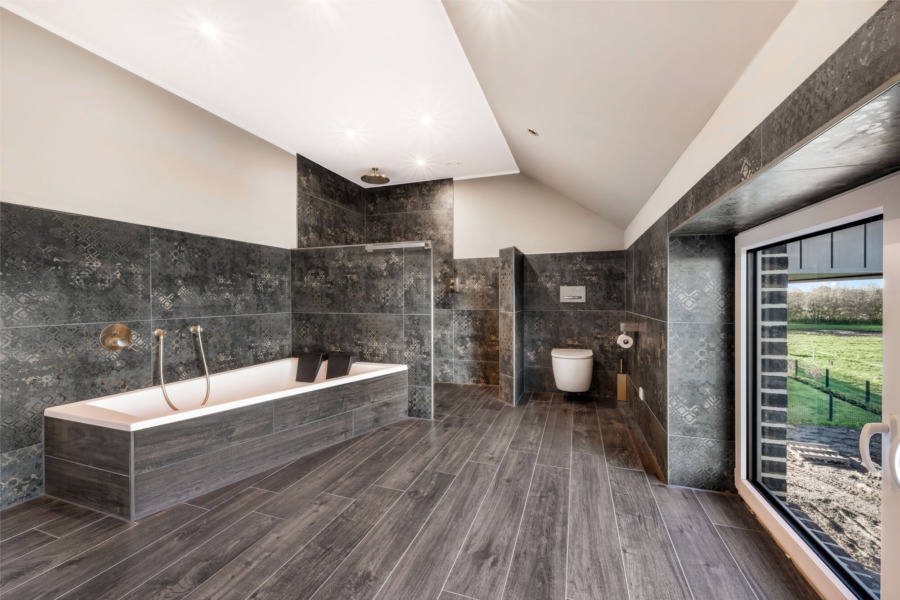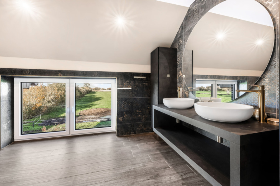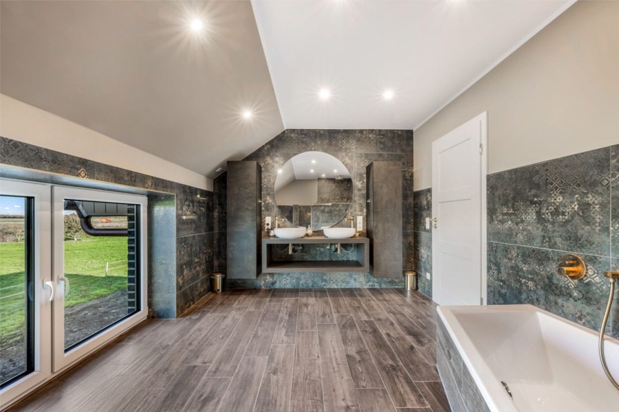 Eine gewendelte Treppe führt ins Obergeschoss. Hier liegt der Hauswirtschaftsraum mit Anschlüssen für Waschmaschine und Trockner. Das große Schlafzimmer mit angrenzendem Ankleidezimmer öffnet den Blick ins Feld und bietet eine ruhige Rückzugsmöglichkeit. Das stilvolle Tageslichtbad ist mit bodengleicher Regendusche und Badewanne ausgestattet. Ein weiteres Zimmer steht als Gäste- oder Arbeitszimmer bereit.