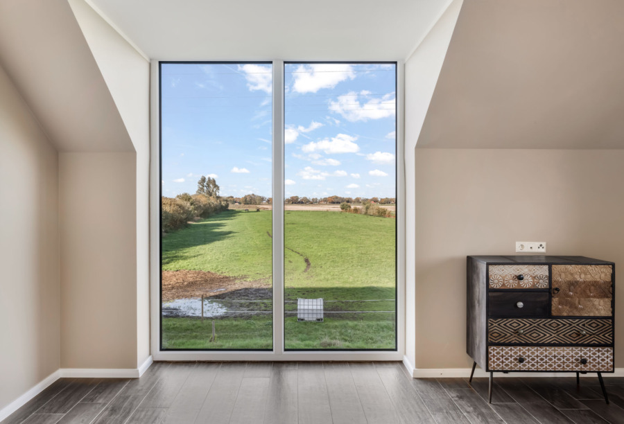 • Schlafzimmer mit Ankleidezimmer und freiem Blick ins Feld bis in die Niederlande