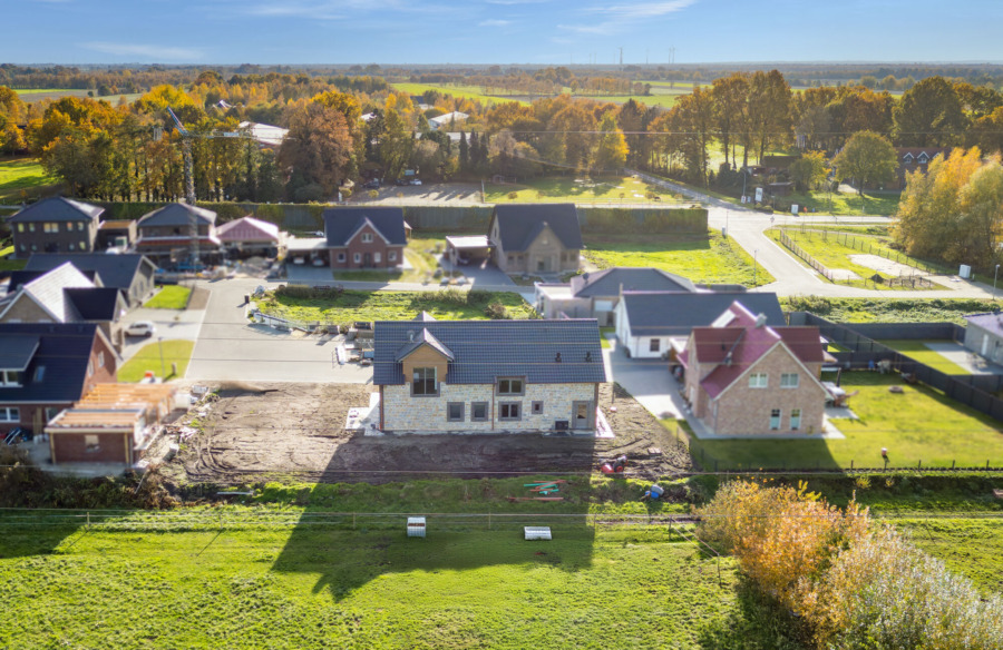 Die Immobilie befindet sich auf einem 942 qm großen Eigentumsgrundstück in einem Neubaugebiet in Twist-Neuringe, direkt an Feldern und Wiesen gelegen mit Blick in die Niederlande.