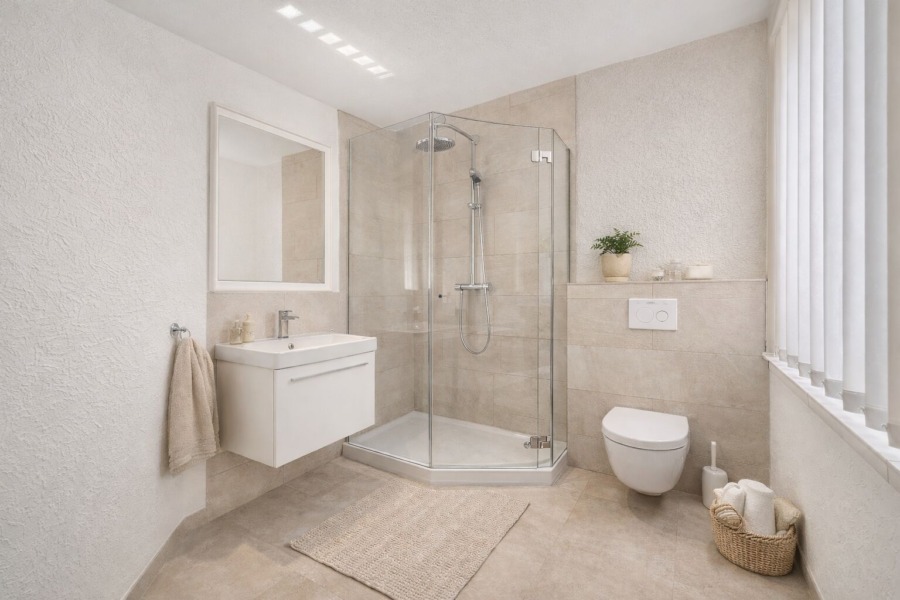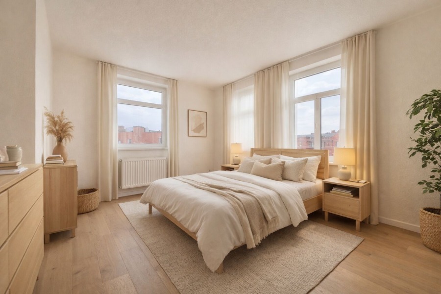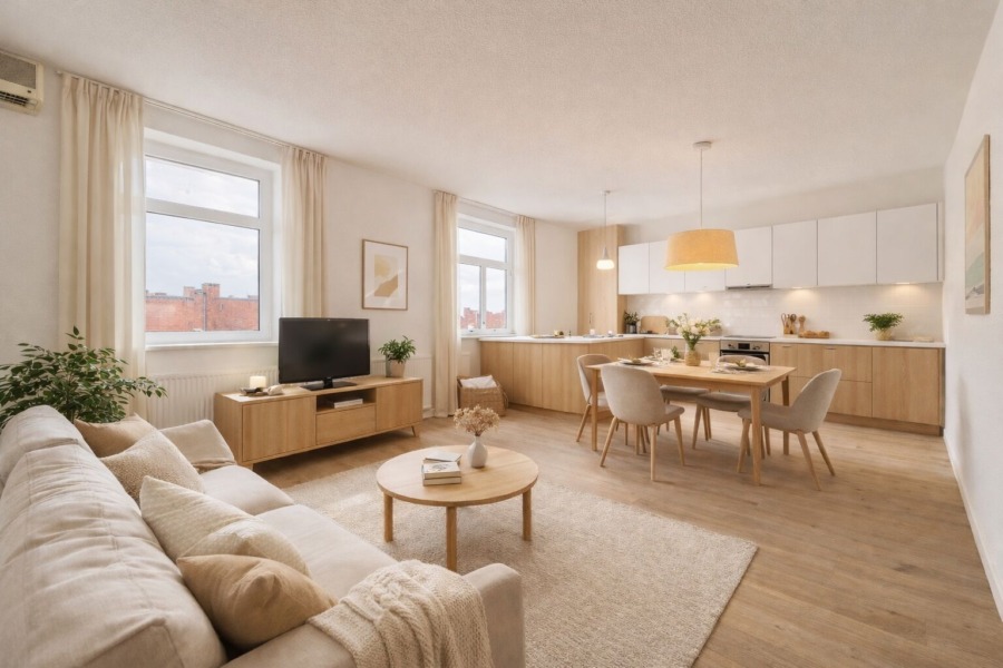 - Die Fotos vom Wohn-/Essbereich inkl. Küche, Tageslichtbad und Schlafzimmer wurden digital visualisiert. Die Visualisierungen dienen als Gestaltungsbeispiel für Neueinrichtung und Dekoration.
