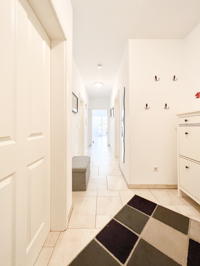 Der großzügige Wohn- und Essbereich mit offener Küche bietet Zugang zur Terrasse in Süd-West-Lage und schafft eine helle und einladende Wohnatmosphäre. Die Einbauküche ist im Mietpreis enthalten und bietet Platz für eine kleine Frühstücksecke.