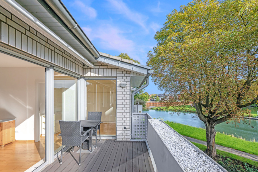 - Wohnzimmer mit Zugang auf den Balkon und Blick auf die Ems und Meppener Innenstadt