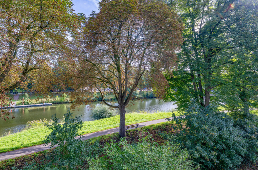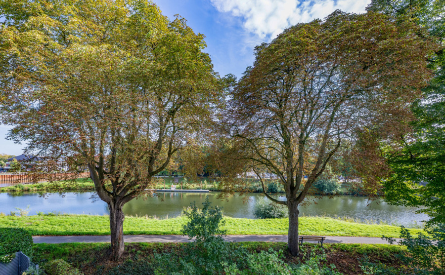 Das helle Wohnzimmer sowie beide Schlafzimmer sind mit hochwertigem Parkettboden ausgestattet und bieten Zugang zu den Balkonen. Vom Wohnzimmer aus eröffnet sich ein wunderschöner Blick auf die Ems und die Meppener Innenstadt. Im Sommer sorgt auf diesem Balkon in Südwestlage eine elektrische Markise für ausreichend Schatten.